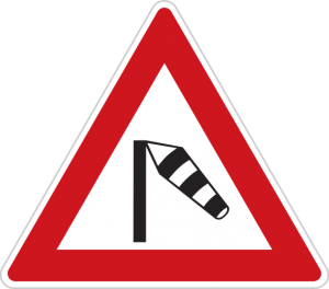 Dopravná značka Bočný vietor upozorňuje na nebezpečenstvo náhleho poryvu bočného vetra.